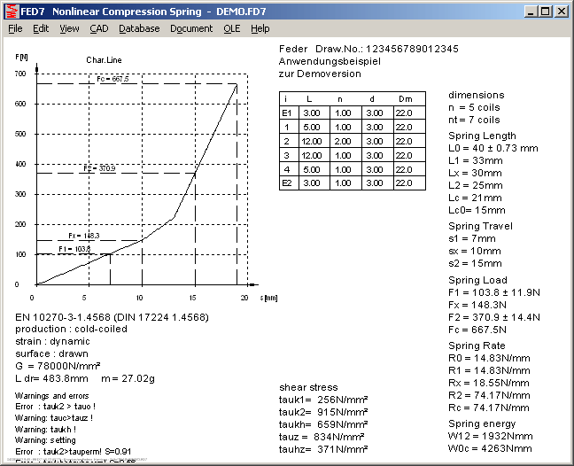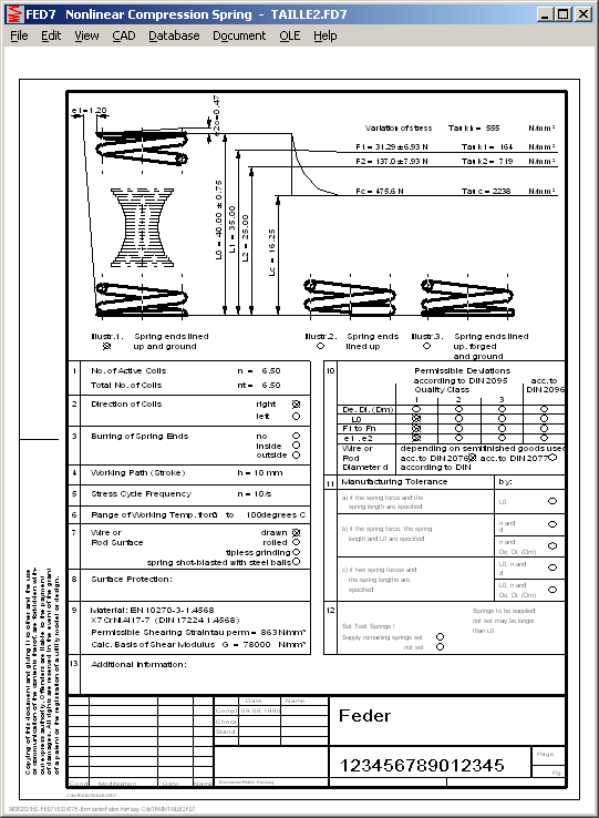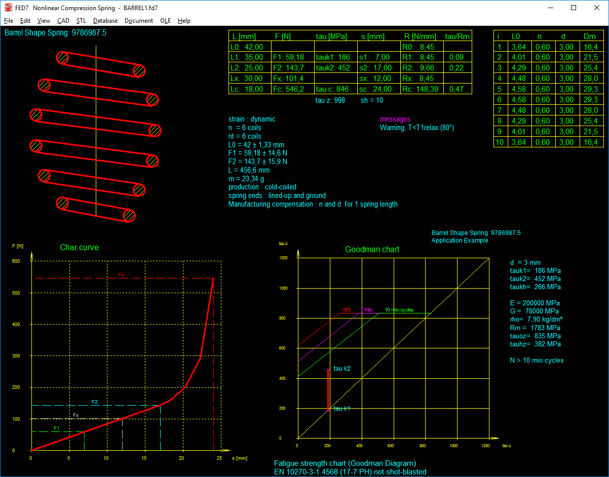 FED7 calculates spring path, spring forces and shearing stress for compression springs of any shape. The curves and schematic spring drawings can be graphically displayed and exported to CAD or word-processing programs via DXF files.