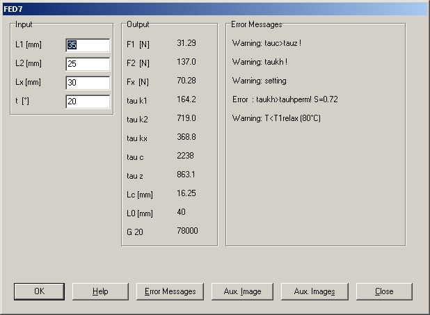 FED7 obtains the values for the most important spring materials (tensile strength, permissible shearing stress in relation to wire diameter, shearing modulus, E modulus, density) from the integrated data base.