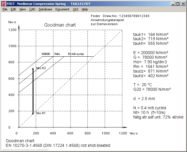 The fatigue stress diagram shows whether or not the permissible elevation stress has been adhered to for dynamically loaded springs. The curves for fatigue stress (>10 mill.) as well as for one million and 100,000 repetitions are included in the diagram.