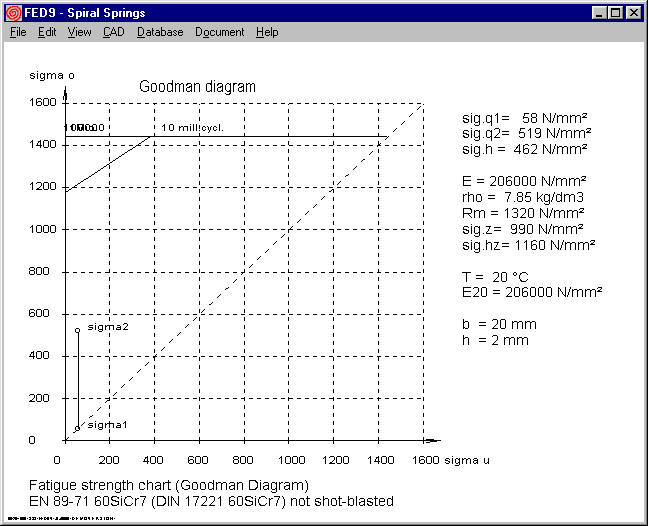 The characteristic data of the most important spring materials (tensile strength, perm. shearing stress in relation to bar diameter, shearing modulus, E-modulus, density) is taken by FED9 from the integrated data base. The DBF file can be edited and appended by the user.