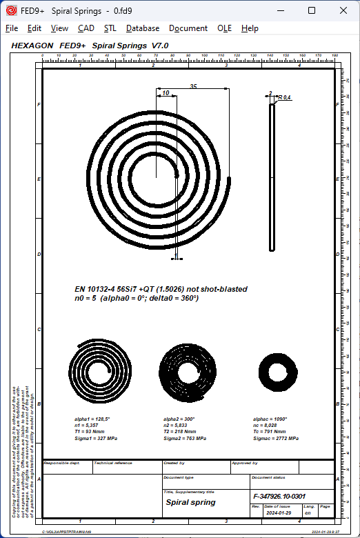FED9+ generates a production drawing of the spiral spring. In an animation you can simulate movement of the spiral spring between different position angles. Quick4 generates drawings, tables and diagrams in an ISO 7200 drawing frame.
