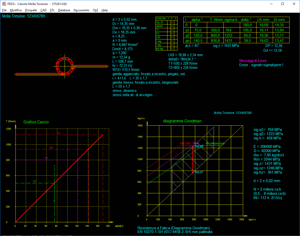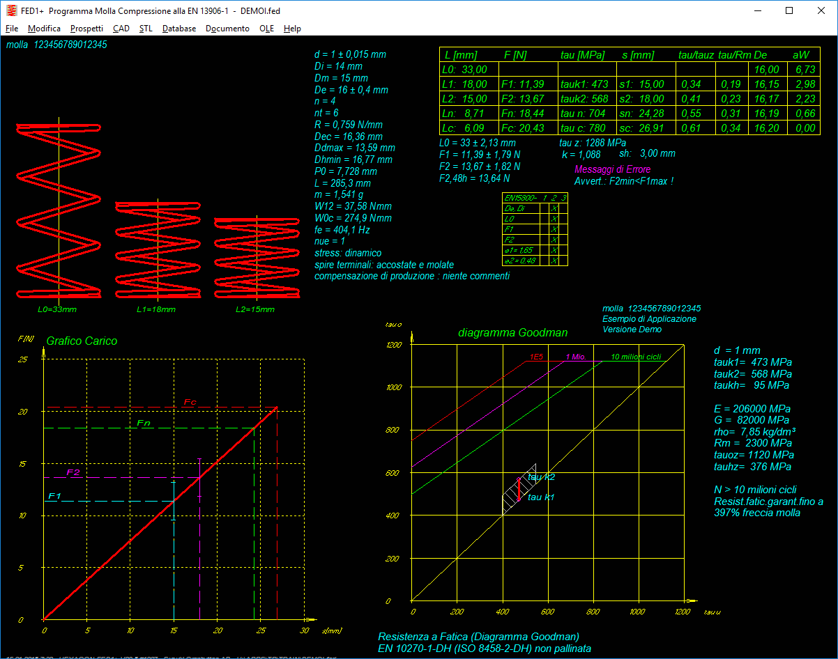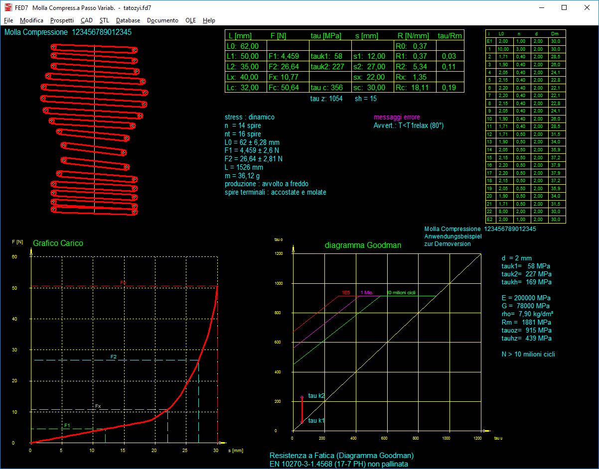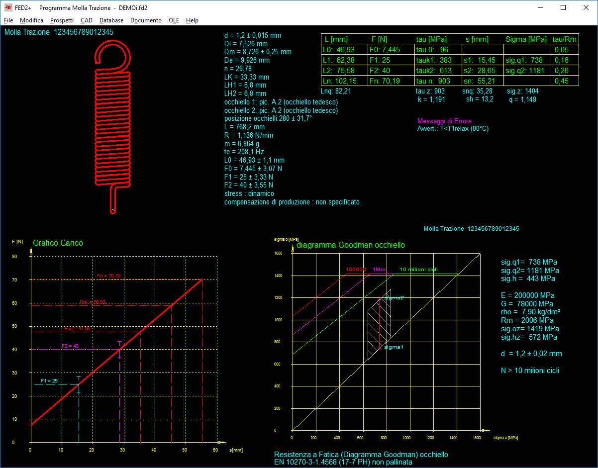 - Stampa del risultato, estratto, curva caratteristica molla (progressiva), diagramma di Goodman, grafico sollecitazione, grafico costante elastica molla.