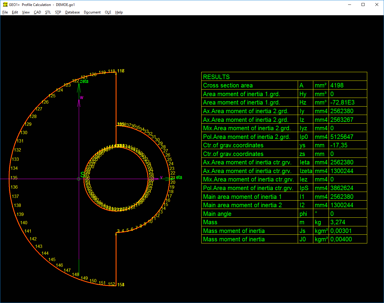 GEO1+ also calculates the main surface moments and the main angle of the coordinate system. The flat surface becomes a body by entering a contour length Lx and the material density. In this case GEO1 also calculates volume, mass and mass moment of inertia at the center of gravity and coordinate origin. For the calculation the arc and boreholes are divided up into