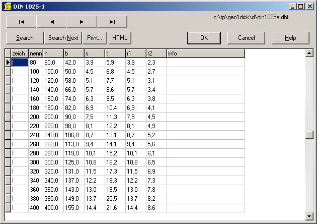 The extended Version GEO1+ contains databases with standard profiles according to DIN: T profiles to DIN 1024, double-T to DIN 1025, L-profile to DIN 1027, angular profile to DIN 1028, U profile to DIN 1026 and rectngular profile to DIN 1017 can be selected from GO1+ database.