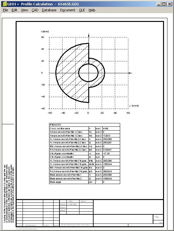 The entered contour is displayed as a graphic on screen along with the coordinates, center of gravity and main axes. The most important result data is shown in a table. The drawings can be output on needle, laser or inkjet printers.