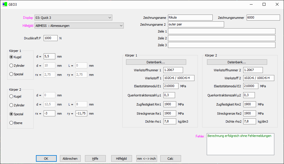 GEO3 kann folgende Körperkombinationen berechnen: Kugel-Kugel, Kugel-Ebene, Zylinder-Zylinder. Die Berührungskontur kann konkav oder konvex sein. Außerdem können Körper mit unterschiedlichem Radius (z.B. Wälzlagerringe) als Spezialkörper mit Radius Rx und Ry eingegeben werden.