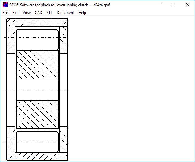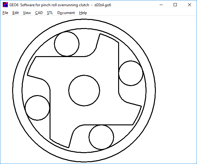 GEO6 calculates dimensions, shifting travel, shifting angle, minimum friction coefficient and Hertzian pressure of pinch roll overrunning clutches with cylindrical rollers. GEO6 generates drawings of inner ring and outer ring as screen view and DXF or IGES file for CAD export. Clutch components can be generated as STL files and printed on your 3D printer, to assemble a full functioning model.