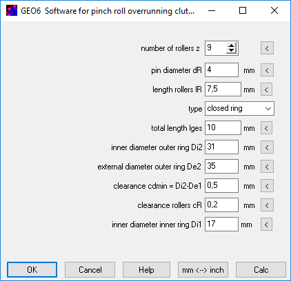 Enter number of rollers, roller diameter, internal and external diameter and width of the clutch, type and clearance. Suggest buttons support you in input of unknown items. GEO6 calculates dimensions of the components. By means of a true-scale drawing on screen you can evaluate and optimize dimensions of the pinch overrunning clutch.