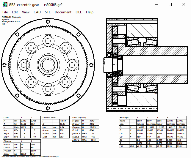 Both, drive shaft and output shaft require two roller bearings. One roller bearing of the drive shaft is bedded in the output shaft. The fifth roller bearing is needed between eccentric shaft and planetary gear. The GR2 software is supplied with databases of groove ball bearings, angular contact ball bearings, cylindrical roller bearings, tapered roller bearings, needle roller bearings and others.