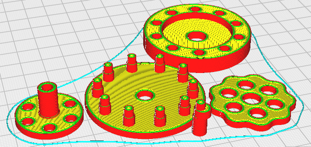 GR3 generates STL files for 3D printing of cam disk, drive shaft, output shaft, bearing cover, bolts and rollers. All that is missing are rolling bearings, screws and pins to build a functional model of the calculated cycloidal gear.