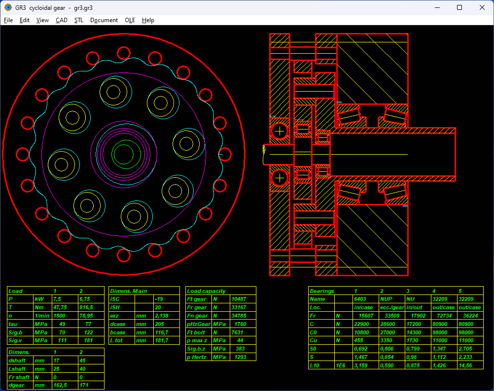 GR3 calculates the safety and service life of the rolling bearings. The most important loads and stresses of the gear components are also calculated. There are interfaces to WL1+ for the precise calculation of the individual components.