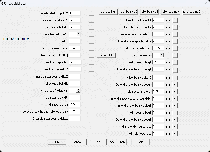 In the dimensions input window, you can optimize and adjust the data from the preliminary design. It is advisable to start by selecting the rolling bearings from the database. After the 5 rolling bearings have been determined, most of the dimensions are fixed. GR3 calculates suggested values ​​for most data fields on request.