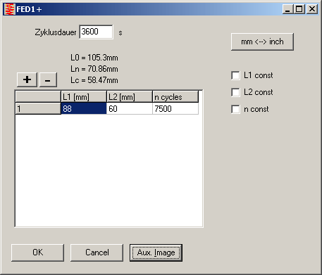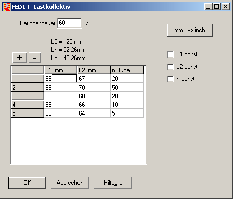 Wenn Hub und Lastspielzahlen nicht konstant sind, sondern periodisch schwanken, kann man ein Lastkollektiv definieren. FED1+ berechnet dann die Lebensdauer der Feder aus dem Lastkollektiv. Eingabewerte für die Lastanteile sind die Federlängen L1 und L2 sowie die Lastspielzahl (Anzahl der Hübe im Lastkollektiv je Periode) und die Periodendauer.