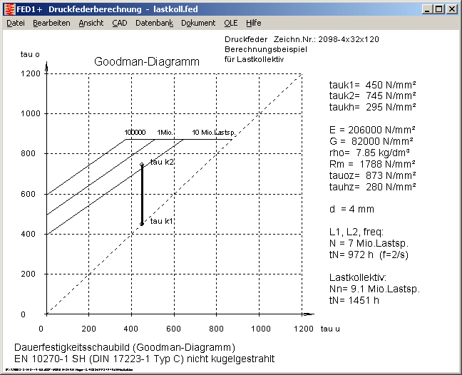 Im Goodman-Diagramm werden wie gewohnt die Schubspannungen tauk1 und tauk2 aus L1 und L2 eingezeichnet, und die Lebensdauer aus diesen Werten und der Lastspielfrequenz berechnet. Weiter unten wird Lastspielzahl und Lebensdauer der Feder bei Berücksichtigung des Lastkollektivs ausgedruckt.