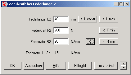 Bei Eingabe der Federrate Ri kann man mit dem Vorschlags-Button "<" die Federrate berechnen lassen, welche einen Knickpunkt der Federkennlinie genau in der Mitte zu der letzten Federposition ergibt. Wenn sich die Federrate in den eingegebenen Punkten nicht verändern soll, verwenden Sie diese Vorgabe. Bei Übernahme des Wertes "Rmin" liegt der Knickpunkt dagegen genau im zuvor eingegebenen Punkt.