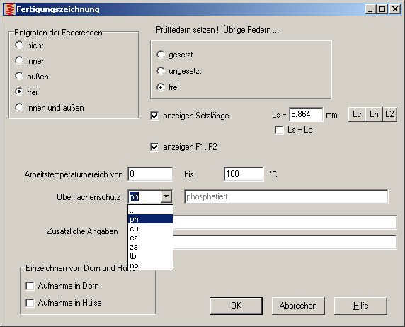 ph = phosphatiert, cu = verkupfert, ez = endverzinkt, za = Zink-Aluminium-Überzug, tb = trockenblank, nb = nassblank.