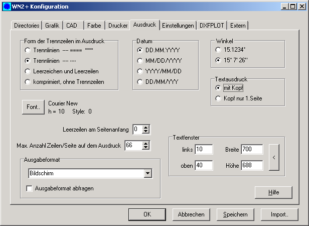 Von neueren Laserdruckern wird anscheinend der Textfont "Courier" nicht mehr unterstützt. Das kommt zum Ausdruck, wenn unter "Datei->Einstellungen->Ausdruck" der Font "Courier" eingestellt ist, auf dem Ausdruck jedoch Proportionalschrift (Arial) oder schwarze Balken gedruckt werden. Der Standard-Textfont für den Textausdruck wurde deshalb umgestellt von "Courier" auf "Courier New".