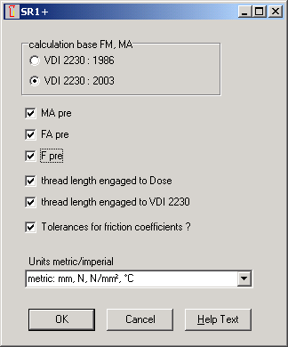 New version of SR1 considers changes in VDI 2230:2003 on fatigue strength calculation. Dependent on selection at "Calculation Method", fatigue strength is calculated to VDI 2230:1986 or VDI 2230:2003. The result for safety SD is almost the same, whether old or new formulas are used.