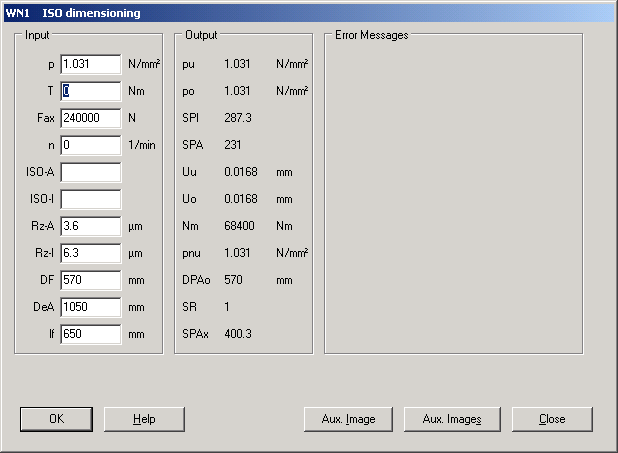WN9 includes calculation of load capacity according to Niemann Machine Elements 1 (2005). Material data can be seleceted from integrated material database. For input of application factor, load distribution factor, load alternating factor and peak load factor, WN9 suggests values or provides auxiliary pictures.