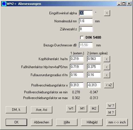 Beispiel: 15 x 12 DIN 5482 df2 = 15, da2 = 12, da1=14.5, df1=11.5, z = 8, m = 1.6, x*m = 0.5 d = m * z = 12.8 x = 0.5 / 1.6 = 0.3125 ha1/m = (da1-d)/(2m) - x = 0.21875 hf1/m = (d-df1)/(2m) + x = 0.71875 ha2/m = (d-da2)/(2m) + x = 0.5625 hf2/m = (df2-d)/(2m) - x = 0.375