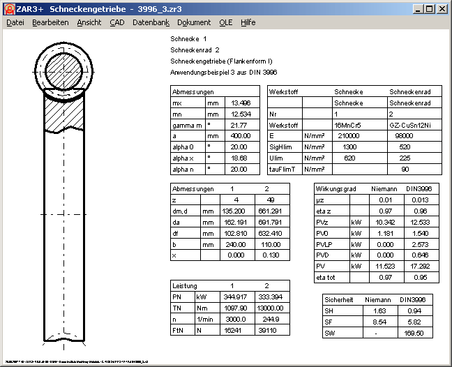 Ergebnistabellen mit Zeichnung Schneckengetriebe.