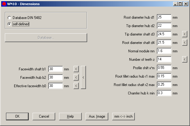 Für die Konstruktion selbstdefinierter, nichtgenormter Zahnwellenprofile ist WN10 ebenfalls gut geeignet: Eingabedaten sind Modul, Zähnezahl, Kopf- und Fußkreisdurchmesser von Zahnwelle und Zahnnabe sowie die Profilverschiebung. Man hat mehr Möglichkeiten für die Definition des Zahnprofils, weil die Zahnhöhenfaktoren nicht festgelegt sind wie in DIN 5480, sondern variabel vom Programm berechnet werden.