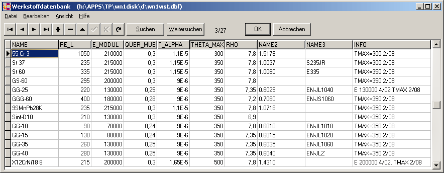 Bei der Werkstoffauswahl kann man jetzt alternativ das Datenbankfenster mit den Eigenschaften des Werkstoffs anzeigen lassen.