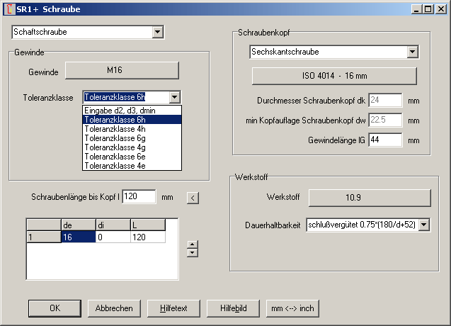 Für die Eingabe der Schraube gibt es jetzt eine alternative Eingabemöglichkeit. Unter "Bearbeiten->Schraube->Neu" kann man die Schraube wie bisher – Step by Step – definieren, unter Bearbeiten->Schraube->Bearbeiten" wurden alle Eingabedaten unter einem Fenster zusammengefasst. Selbstverständlich können Sie auch neue Schrauben hier definieren, aber es sollte die richtige Eingabereihenfolge eingehalten werden (erst Typ, dann Gewinde, usw.).