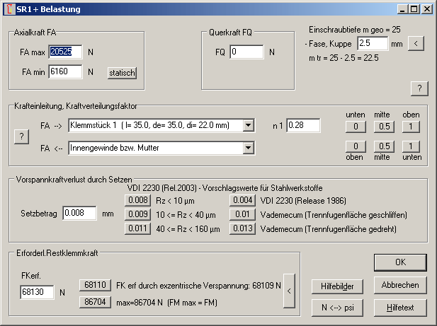 Bei der Abstreifsicherheit waren bisher nichtragende Gewindeabschnitte durch Fasen beim Muttergewinde und Kuppe bei der Schraube nicht berücksichtigt worden. Jetzt kann man unter "Bearbeiten->Last" den Betrag nichttragender Gewindeanteile bei der Berechnung berücksichtigen. Bei Sacklochverschraubung ist dies die Fase am Muttergewinde und die Kuppe an der Schraube, bei Durchsteckverschraubung zwei Fasen an der Mutter. Empfohlen wird ein Betrag zwischen 1.0 und 2.0 x Gewindesteigung. Mit "<" wird 1.0 x P eingesetzt.