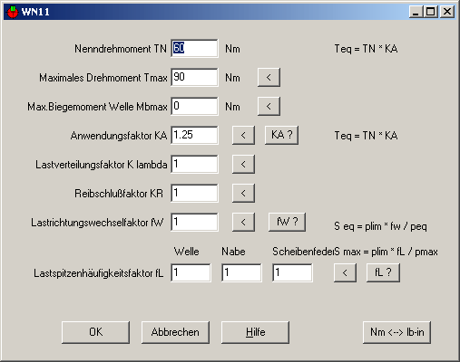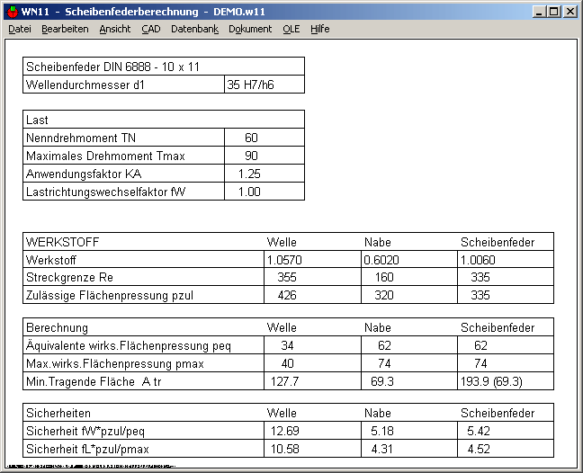 In der Nachrechnung nach DIN 6892 werden zusätzlich maximales Drehmoment, Lastverteilungsfaktor, Reibschlußfaktor (bei Preßpassungen), zusätzliches Biegemoment, Lastrichtungswechselfaktor und Lastspitzenhäufigkeitsfaktoren berücksichtigt. Die Stütz- und Härteeinflußfaktoren für Welle, Nabe und Scheibenfeder übernimmt WN11 automatisch aus den Werkstoffdatenbanken. Berechnet werden Sicherheiten gegen Bruch durch maximales und äquivalentes Drehmoment für Scheibenfeder, Welle und Nabe.