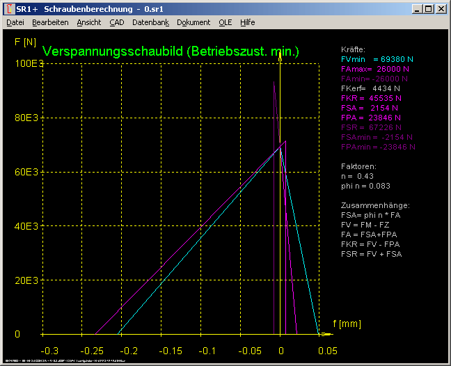 Ein zusätzliches Verspannungsschaubild bildet Kräfte und Verformungen bei minimalen Anziehdrehmoment bzw. minimaler Montagevorspannkraft im Betriebszustand ab. Eingezeichnet wird die Betriebskraft FA (auch FAmin bei Druckbeanspruchung) , die Restklemmkraft FKR bzw. FSR kann man ablesen im Schnittpunkt der violetten Kraft-Verformungslinien.