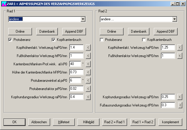 Das Eingabefenster für die Abmessungen des Bezugsprofils wurde übersichtlicher gestaltet. Wenn man "Protuberanz" und "Kopfkantenbruch" nicht markiert, werden nur noch die Eingabefenster für Zahnhöhenfaktoren sowie Kopf- und Fußradius angezeigt. Ein Fußausrungsradius Werkzeug kann nur eingegeben werden, wenn keine Fase (Kopfkantenbruch) eingegeben wird. Neu sind auch die Vorschlagsbuttons mit Standardeingaben. Ein Klick auf "<" beim Werkzeug-Kopfradius raP0/mn berechnet den Radius für die größtmögliche Fußausrundung beim Zahn. Zu beachten ist, daß die Kopffaktoren des Werkzeugs die Fußfaktoren des erzeugten Zahnes ergeben und umgekehrt.