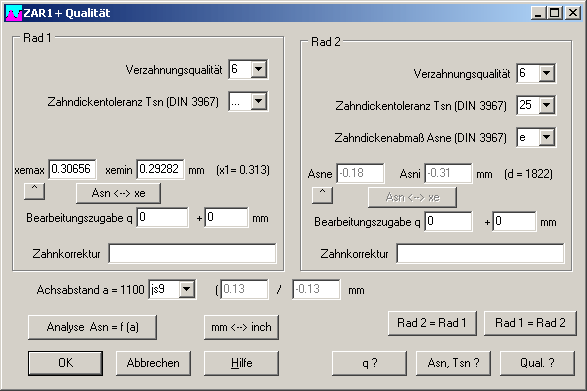 Der Button "^" ist gleichbedeutend mit Anwahl von ".." unter Zahndickentoleranzklasse Tsn. Die Eingabefelder Asne und Asni sind dann frei zur Eingabe. Jetzt kann man mit dem Button "Asn <-> xe" umschalten auf Eingabe der Profilverschiebungsfaktoren.