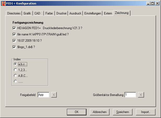 Unter Datei->Einstellungen gibt es einen neuen Reiter mit Zeichnungseinstellungen. Für die Fertigungszeichnung kann man konfigurieren, ob eine Überschriftszeile, der Dateiname, Datum, und Firmenlogo eingezeichnet werden soll.