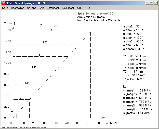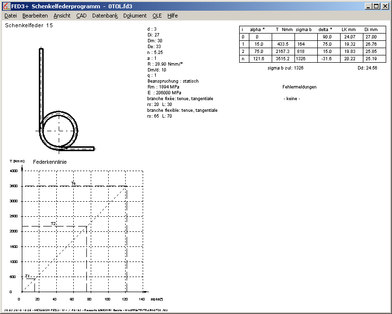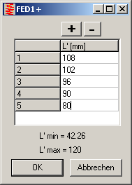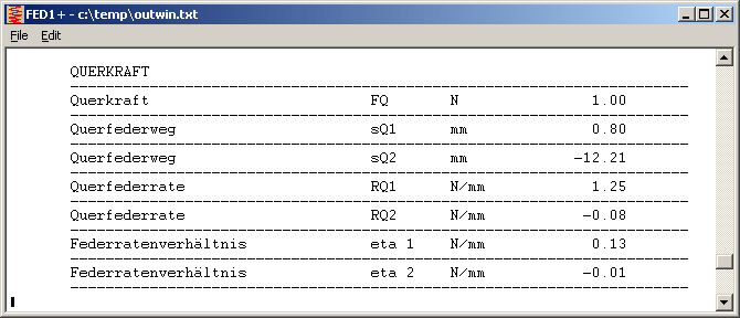 Unter "Bearbeiten->Nachrechnung Federkennlinie" kann man jetzt bis zu 6 zusätzliche Federlängen (FED1+, FED2+) bzw. Federwinkel (FED9) eingeben, die im Ausdruck oder unter Ansicht->Federkennlinie F'-s' angezeigt werden. Um Verwechslungen mit L1 und L2 zu vermeiden, wird an den Index ein Hochkomma angehängt (L1', L2'.. L6').