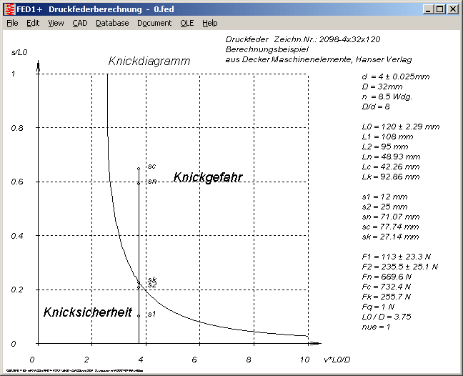 Wenn man für Querfederweg und Querfederrate negative Werte erhält, knickt die Feder aus. Dies kann man leicht im Knickdiagramm nachvollziehen (nue=1!): Wenn s2 nahe an der Grenze zur Knickzone liegt, wird der Querfederweg sq2 sehr groß. Für s2=sk ist sq2 unendlich groß, und wenn s2 in der Knick-Zone liegt (s2>sk) wird sq2 negativ.
