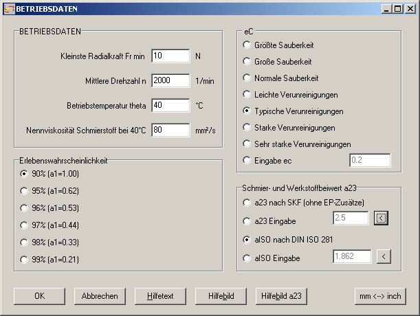Anstelle der erweiterten Lebensdauer Lna nach SKF kann man nun alternativ auch die erweiterte Lebensdauer Lnm nach DIN ISO 281 berechnen. Diese ist abhängig von Schmierung und Sauberkeit der Wälzlager. Für die Berechnung der modifizierten Lebensdauer nach DIN ISO 281 wird die "Ermüdungsgrenzbelastung Cu" benötigt, deshalb mussten alle Datenbanken um dieses Feld erweitert werden. Wenn Berechnung nach DIN ISO 281 gewählt wird, muss die Sauberkeit aus einer Tabelle gewählt gewählt oder der Faktor ec eingegeben werden.