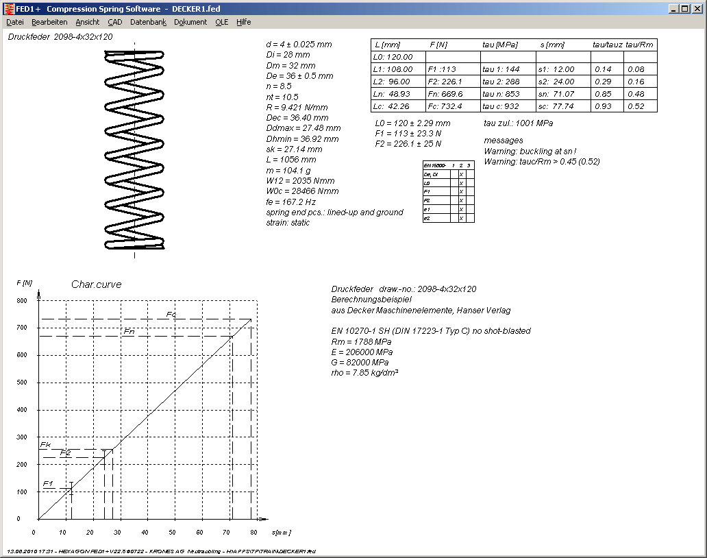 Toleranzen von ungefederter Länge L0 und den Federkräften F1 und F2 werden in der Quick3-Ansicht mit ausgedruckt.