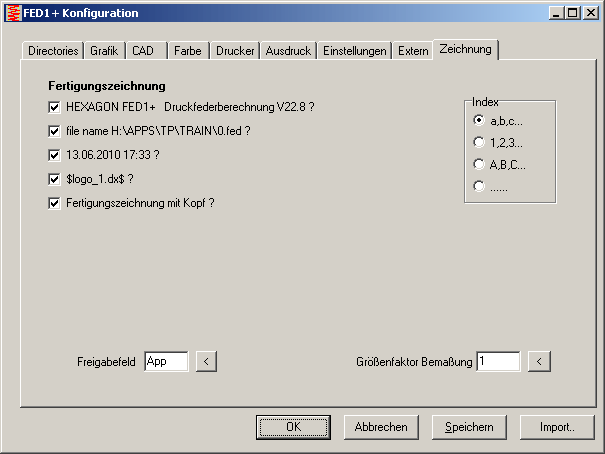 Wenn Sie die Fertigungszeichnung ohne Zeichnungskopf in CAD übernehmen wollen, um dann Ihren eigenen Zeichnungsrahmen einzufügen, können Sie jetzt unter "Datei->Einstellungen->Zeichnung" die Option "Fertigungszeichnung mit Kopf?" zurücksetzen. Beachten Sie, daß dann Zeichnungsname, Zeichnungsnummer, Bearbeiter, Änderungsindex usw. fehlen