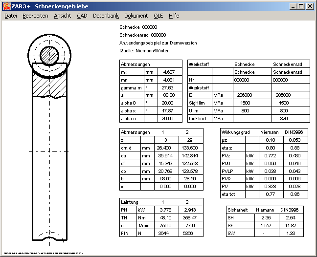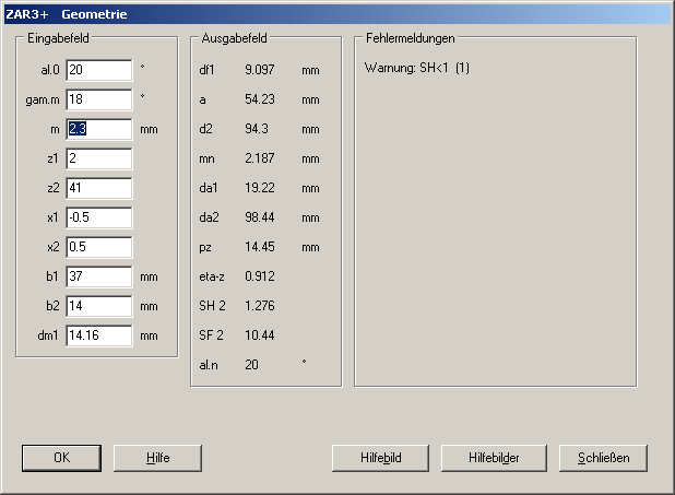 Die Nachrechnung vorhandener Schnecken und Schneckenräder war bislang schwierig, wenn die Daten vom Gegenrad nicht bekannt waren. Jetzt kann man unter "Bearbeiten->Abmessungen->Nachrechnung" Eingriffswinkel, Schrägungswinkel, Modul, Zähnezahlen, Profilverschiebungsfaktoren und Zahnbreiten eingeben. Achsabstand und Verzahnungsdaten werden berechnet. Bei Eingabe des Mittenkreisdurchmessers dm1 wird der Axialmodul m neu berechnet. Bei der Eingabe Abmessungen gibt es nun "Auslegung" und "Nachrechnung".