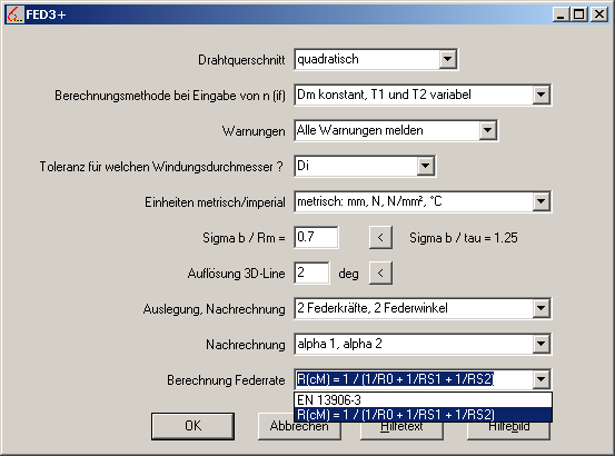In EN 13906-3 wird zwar die Berechnung der Federwinkel durch Schenkelbiegung bei abgestützten Schenkeln beschrieben, diese aber bei der Federrate nicht direkt berücksichtigt. So rechnete bislang auch FED3. Unter Bearbeiten -> Berechnungsmethode kann man jetzt unter "Berechnung Federrate" die Berücksichtigung der Schenkelbiegung bei der Berechnung der Federrate berücksichtigen: