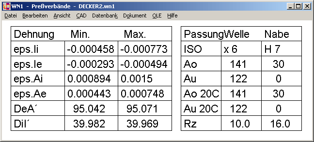 Durch die Verpressung bzw. Schrumpfung wird die Nabe aufgeweitet und die Welle gestaucht. Die Verformungsfaktoren und Aufweitung wurden bisher schon im Ausdruck gelistet. Jetzt wird auch noch der aufgeweitete Außendurchmesser der Nabe und bei Hohlwellen der Innendurchmesser Dii nach dem Preßvorgang ausgedruckt. Außerdem wird eine Tabelle mit diesen Daten in der Quick-Ansicht gelistet, allerdings nur für nicht abgestufte Naben.