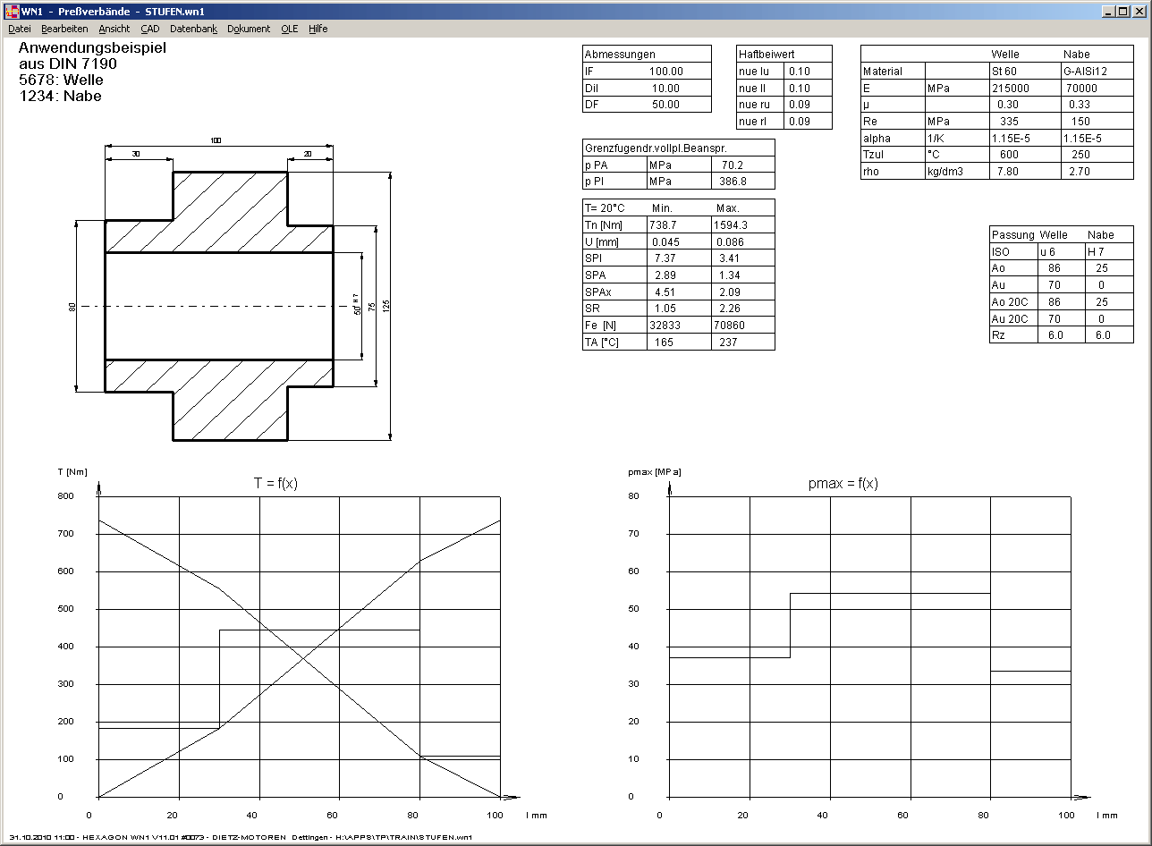 Bei abgestufter Nabe berechnet WN1 Pressung und übertragbares Drehmoment für jeden Abschnitt. Den Verlauf über die Nabenlänge kann man jetzt als Diagramm anzeigen.