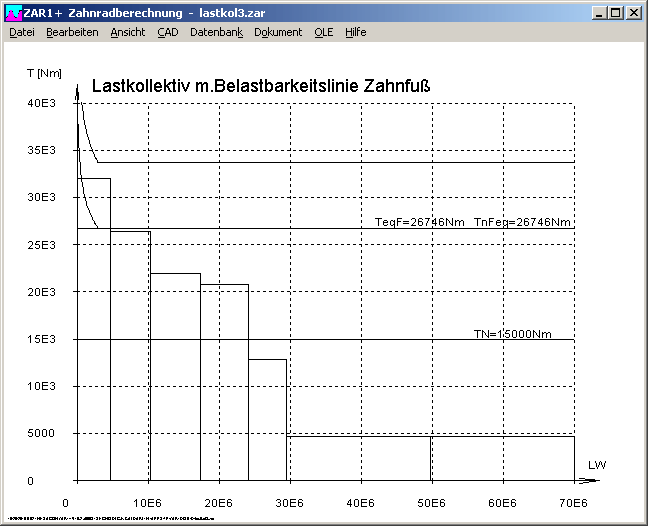 Aus einem Lastkollektiv mit anteiligen Drehmomentstufen und den zugehörigen Lastwechselzahlen berechnet ZAR1+ äquivalentes Moment und die zugehörige Lastwechselspielzahl sowie die Anwendungsfaktoren KAH und KAF. Gemäß DIN 3990-T6 werden dabei nur Laststufen mit Ti > Tn/2 berücksichtigt (Drehmoment muß größer als 50% des Nenndrehmoments sein). In ZAR1+ wurde bislang nur die Stufe mit dem geringsten Drehmoment (Leerlaufanteil) überprüft. Jetzt werden alle Stufen auf dieses Kriterium geprüft und gegebenenfalls herausgefiltert.