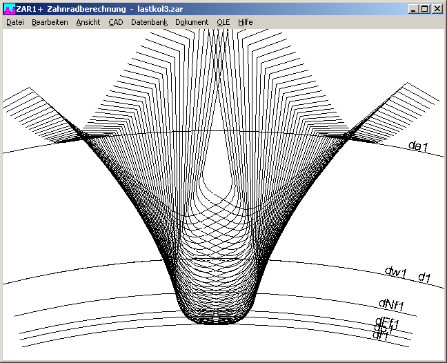 In den Zahnradprogrammen werden bei schrägverzahnten Stirnrädern alle Profilzeichnungen im Stirnschnitt dargestellt. Einzige Ausnahme: Die Bezugsprofilzeichnung (Verzahnungswerkzeug) wird im Normalschnitt dargestellt. Bei den Hüllkurvendarstellungen der Zahnradprofile wird das Trapezprofil des Verzahnungswerkzeug als Hüllkurve im Stirnschnitt gezeichnet.