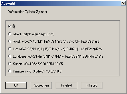 Für die Paarung Zylinder-Zylinder und Zylinder-Ebene gibt es keine analytische Lösung zur Berechnung von Deformation w0 (und Federrate R). Unter "Bearbeiten->Berechnungsmethode" kann man jetzt wählen zwischen verschiedenen Formeln für Näherungsberechnungen der Deformation (=Annäherung der beiden Körper). Außer der bisherigen Formel einer rein geometrischen Berechnung aus Halblänge der Kontaktachse und Zylinderradien gibt es noch verschiedene Näherungsformeln aus der Literatur: nach Arnell, Ina, Lundberg, Kunert und Palmgren. Standardeinstellung ist 0 (keine Berechnung von w0 und R, nur Flächenpressung (pmax) und Abmessungen des Druckrechtecks (a) werden berechnet).