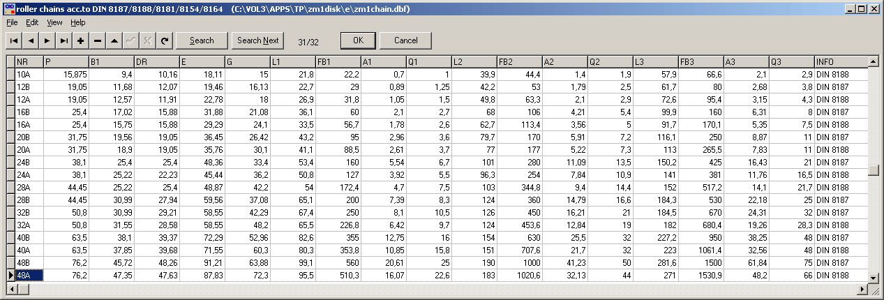 Roller chains of European style are described in DIN 8187, American roller chains according to DIN 8188. Both types are covered by ISO 606. ZM1 database included only few chain sizes to DIN 8188 until now. Database now was extended with roller chains 10A, 12A, 16A, 20A, 24A, 32A, 40A and 48A. ZM1 generates sprocket profile as CAD file.