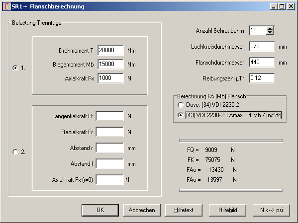 Formel (43) aus VDI 2230-2 wird nun in SR1+ als alternative Berechnung aufgenommen, konfigurierbar unter "Bearbeiten->Berechnungsmethode" oder "Bearbeiten->Flansch". In der Flanscheingabe kann man die Berechnungen umschalten und beobachten, wie sich die Ergebnisse unterscheiden.