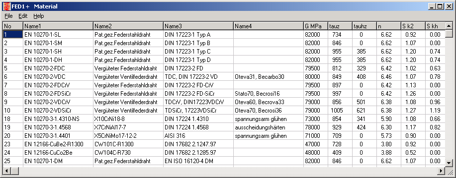Neu unter "Bearbeiten->Auslegung Werkstoff": Alle Werkstoffe aus der Datenbank werden berechnet und die Ergebnisse in einer Tabelle angezeigt. G = Schubmodul, tauz = zulässige Schubspannung, tauhz = zul. Hubspannung, n = Windungszahl, S k2 = Sicherheit Oberspannung tauz/tauk2, S kh = Sicherheit Hubspannung = tauhz/(tauk2-tauk1). Ähnlich wie unter "Ansicht->Auslegung Werkstoff", aber hier kann man auch die Werkstoffe sortieren, indem man mit der rechten Maustaste in die Überschrift der gewünschten Spalte klickt. Außerdem wird mit einem Mausklick auf einen Datensatz (oder mit Cursortasten) die Feder mit dem gewählten Werkstoff berechnet und die Ergebnisse im Hintergrund angezeigt.
