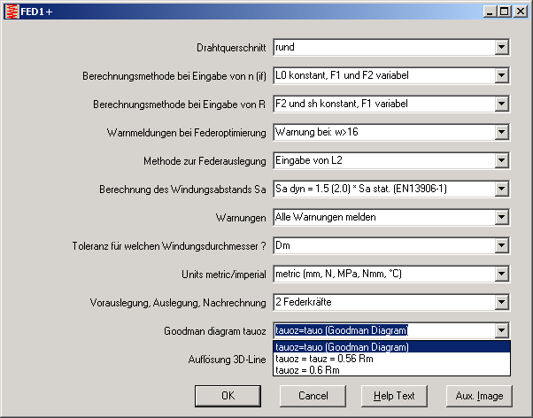 Bei den kürzlich in der Datenbank ergänzten GARBA 177 Werkstoffen ist zu beachten, daß das Goodman-Diagramm aus warm vorgesetzten Federn ermittelt wurde. Nun gibt es in den Federprogrammen und nach EN-Norm zwar unterschiedliche Dauerfestigkeitsschaubilder für kugelgestrahlte und nicht-kugelgestrahlte Federn, nicht jedoch für vorgesetzte und nicht vorgesetzte. Die zulässige Oberspannung kann bei vorgesetzten Federn um den Setzbetrag höher sein, deshalb gibt es jetzt unter "Bearbeiten->Berechnungsmethode" eine neue Einstellung "tauoz = 0.6 Rm" für vorgesetzte Federn. In dieser Einstellung wird für die maximale Oberspannung im Goodman-Diagramm (obere waagrechte Linie) nicht der ursprüngliche Diagrammwert verwendet, sondern der Wert von 60% der Zugfestigkeit Rm.